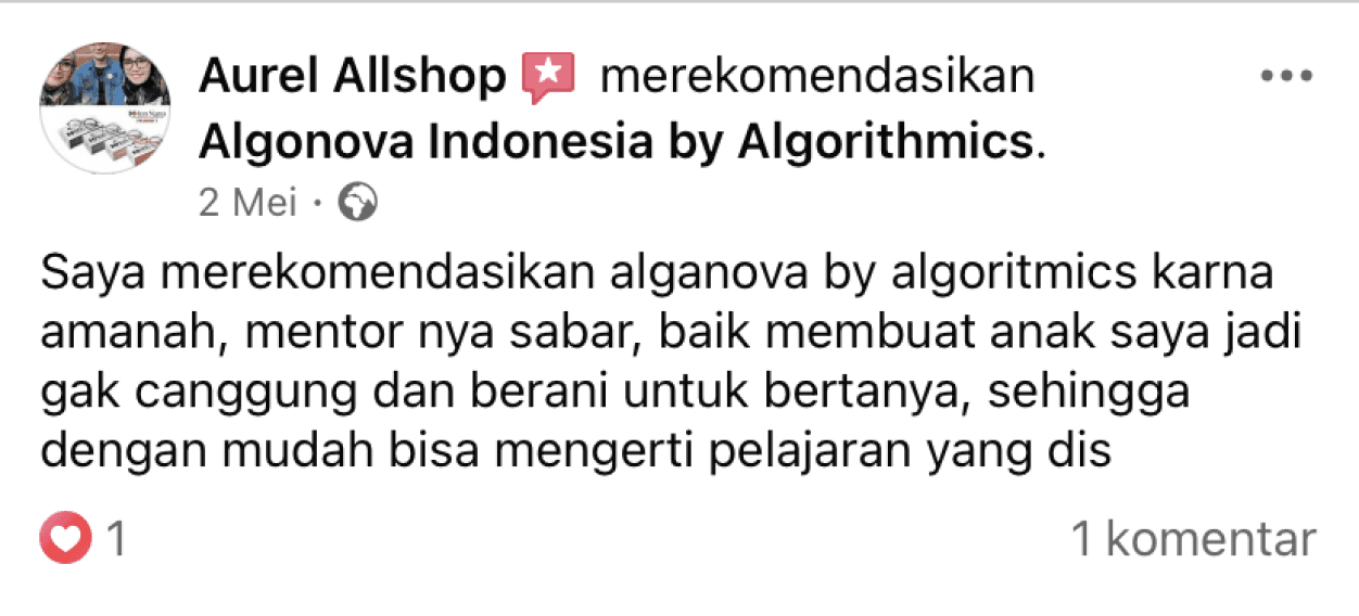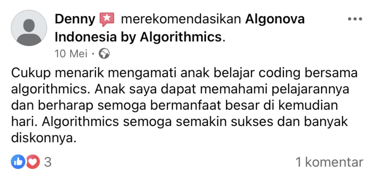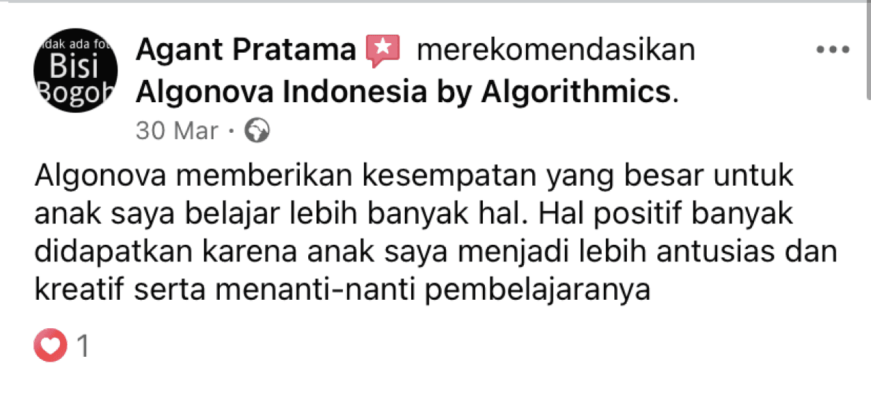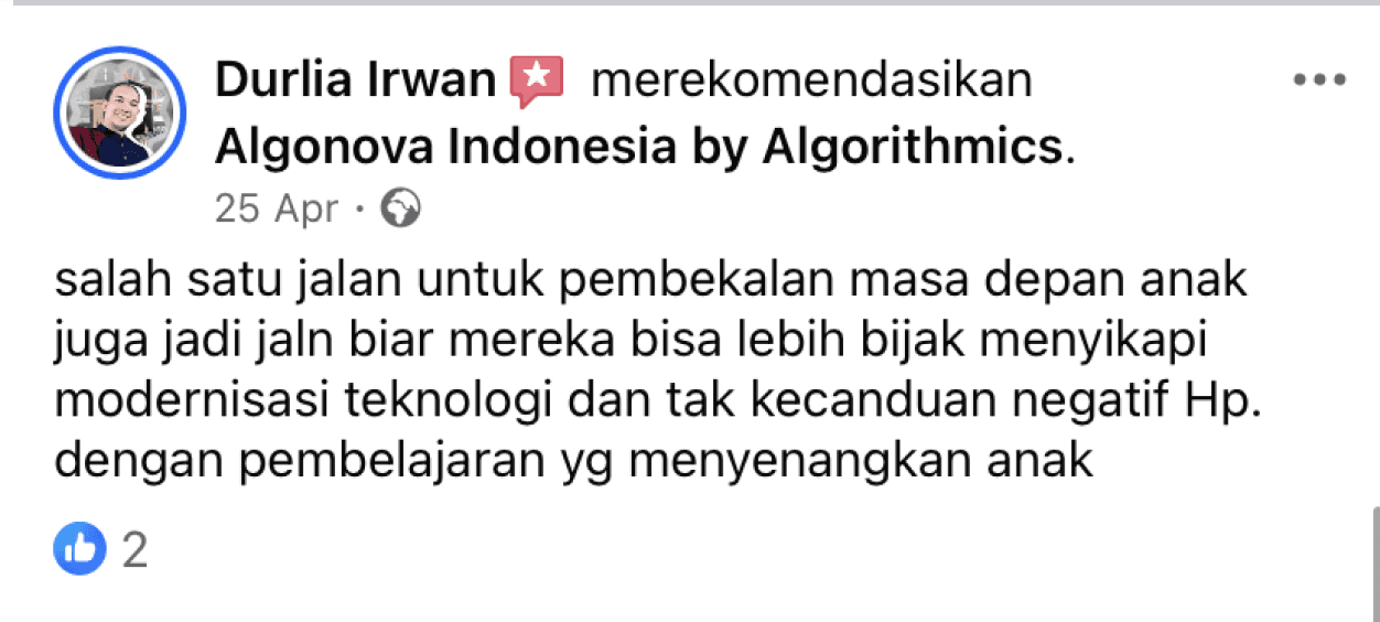 Algonova adalah sekolah IT dan Matematika untuk anak dan remaja yang membantu menemukan bakat mereka dan mengembangkannya menjadi keterampilan modern yang dibutuhkan di masa depan, melalui jalur belajar yang dipersonalisasi.
