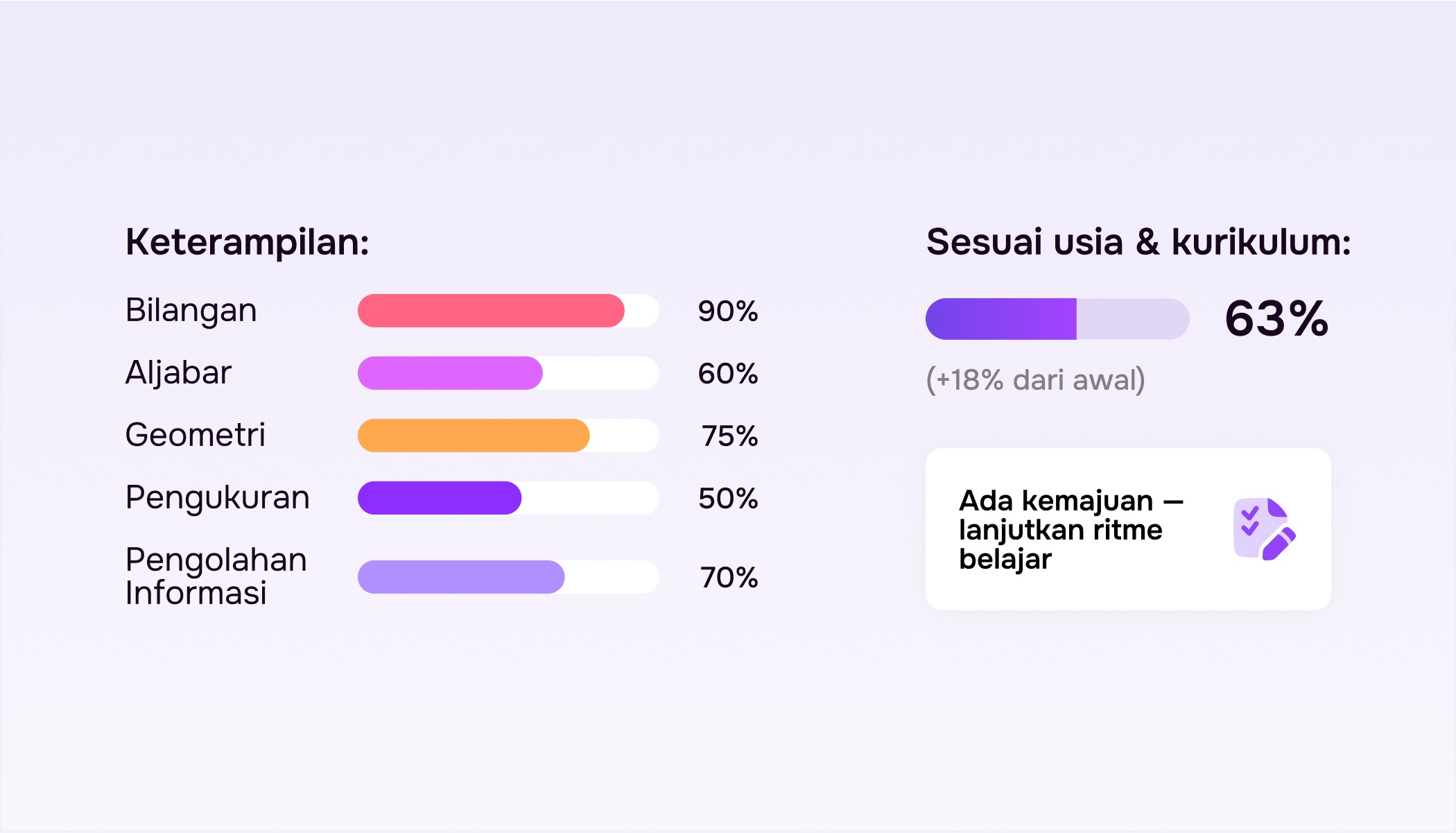 Anak hanya lanjut ke topik berikutnya setelah benar-benar paham yang sebelumnya. Latihan rutin bantu memperkuat pemahaman.
