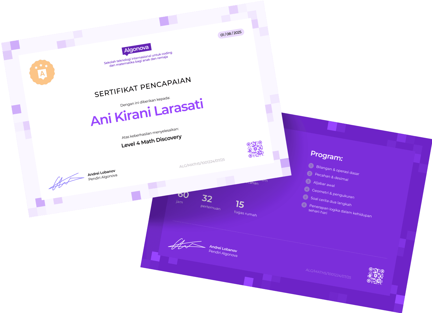 Algonova adalah sekolah IT dan Matematika untuk anak dan remaja yang membantu menemukan bakat mereka dan mengembangkannya menjadi keterampilan modern yang dibutuhkan di masa depan, melalui jalur belajar yang dipersonalisasi.